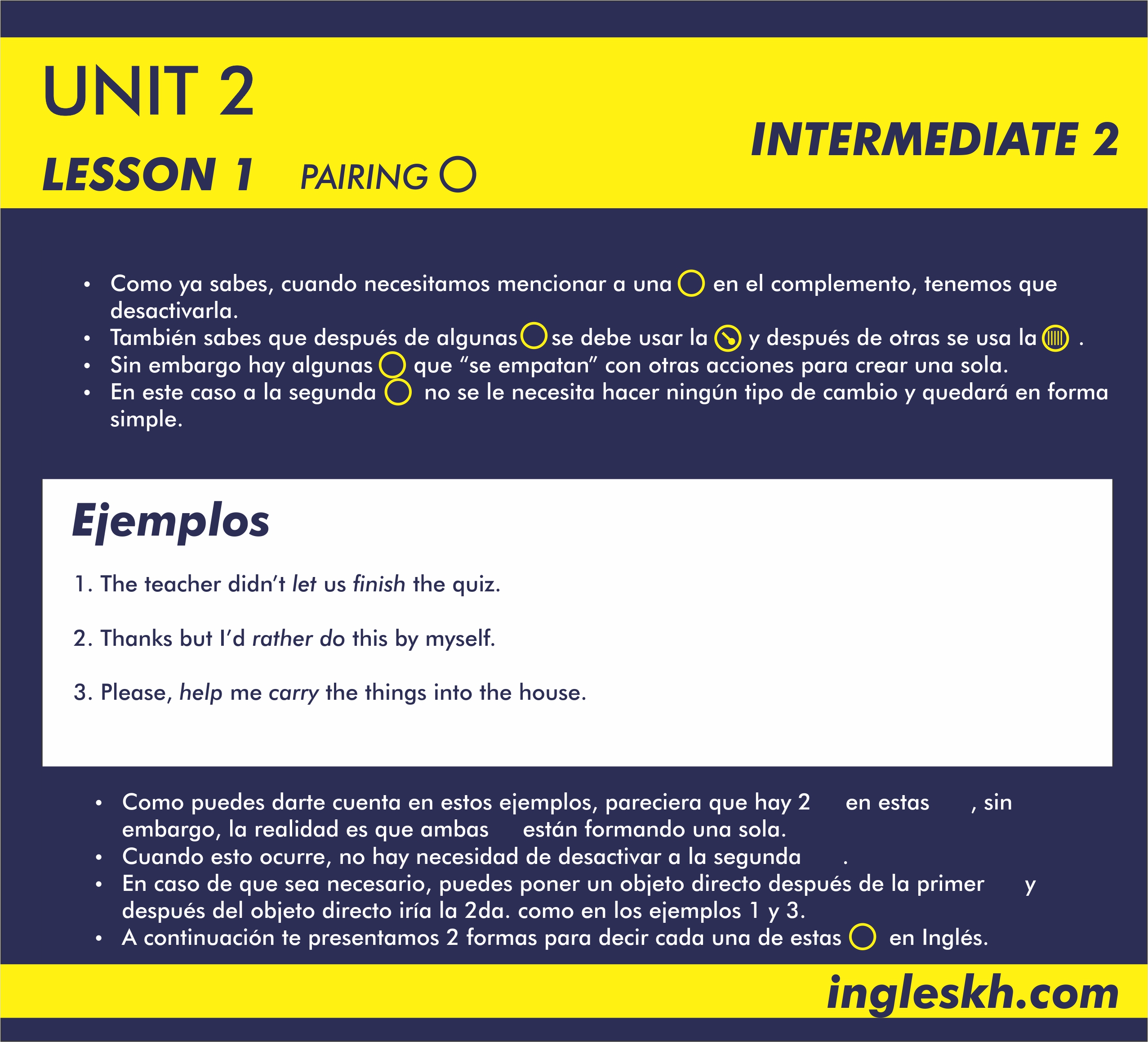 INTERMEDIATE 2 UNIT 4 LESSON 1 / PAIRING ACTIONS DEJAR O PERMITIR PREFERIR OFRECERSE A HACER ALGO HACER QUE ALGUIEN HAGA ALGO OÍR A ALGUIEN HACER ALGO AYUDAR NECESITAR